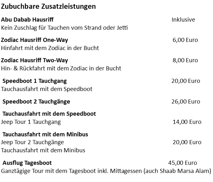 • alle weiteren durch die Tauchbasis angebotenen Zusatzleistungen