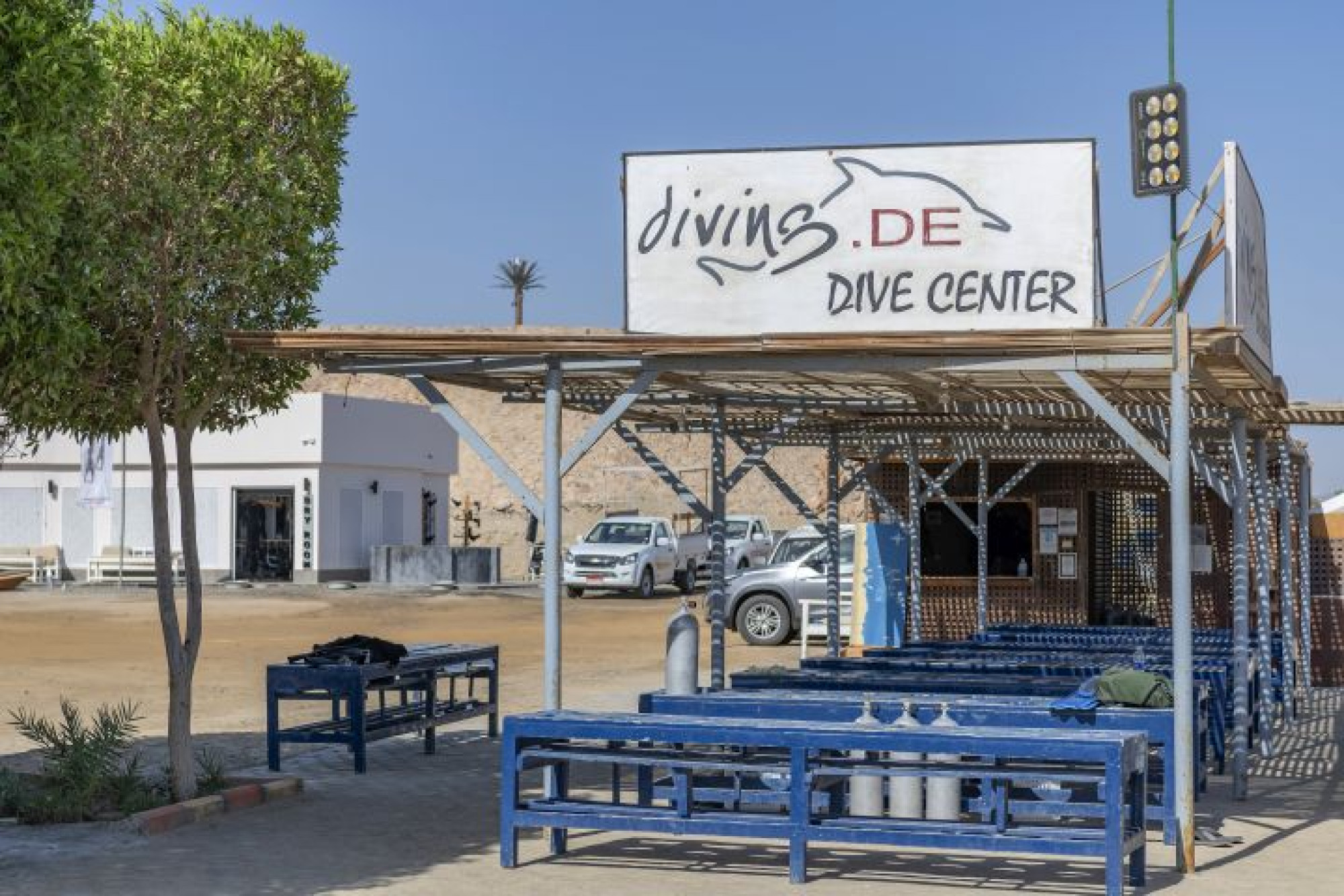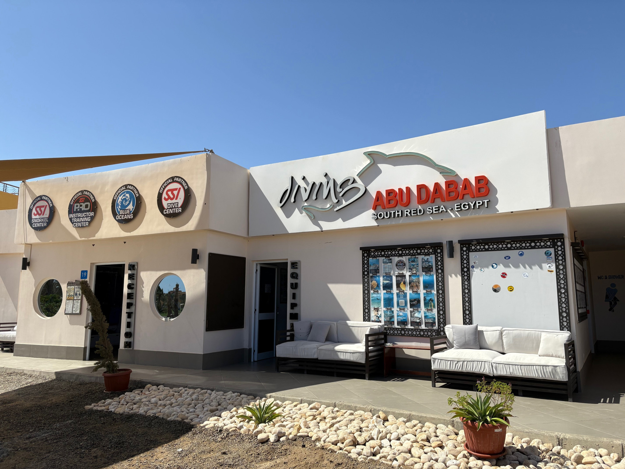 Im August 2015 hat diving.DE die Tauchbasis übernommen und ist 2024 in ein neu gebautes Gebäude näher an den Strand der Bucht gezogen. Das wunderschöne Hausriff befindet sich ca. 150m von der Tauchbasis entfernt und kann direkt über den breiten Sandstrand der Bucht von Abu Dabab erreicht werden. Direkt nach dem leichten und durch die Bucht geschützten Einstieg beginnt rechts das traumhaft bunte Korallenriff von Abu Dabab. Hier liegt auch das Schlauchboot, mit dem die Taucher die Bucht erkunden können. An der Ostseite des Resorts befindet sich ein Steg, von dem aus die Außenseite des Hausriffs betaucht werden kann. Außerdem liegen hier die zwei Schnellboote der Tauchbasis mit denen die vorgelagerten Riffe angefahren werden. Außerdem werden täglich Halbtagestouren mit Minibussen zu den umliegenden Landtauchplätzen angeboten und auch Ganztagestouren mit dem eigenen Boot nach Shaab Marsa Alam und Elphinstone stehen auf dem Programm.