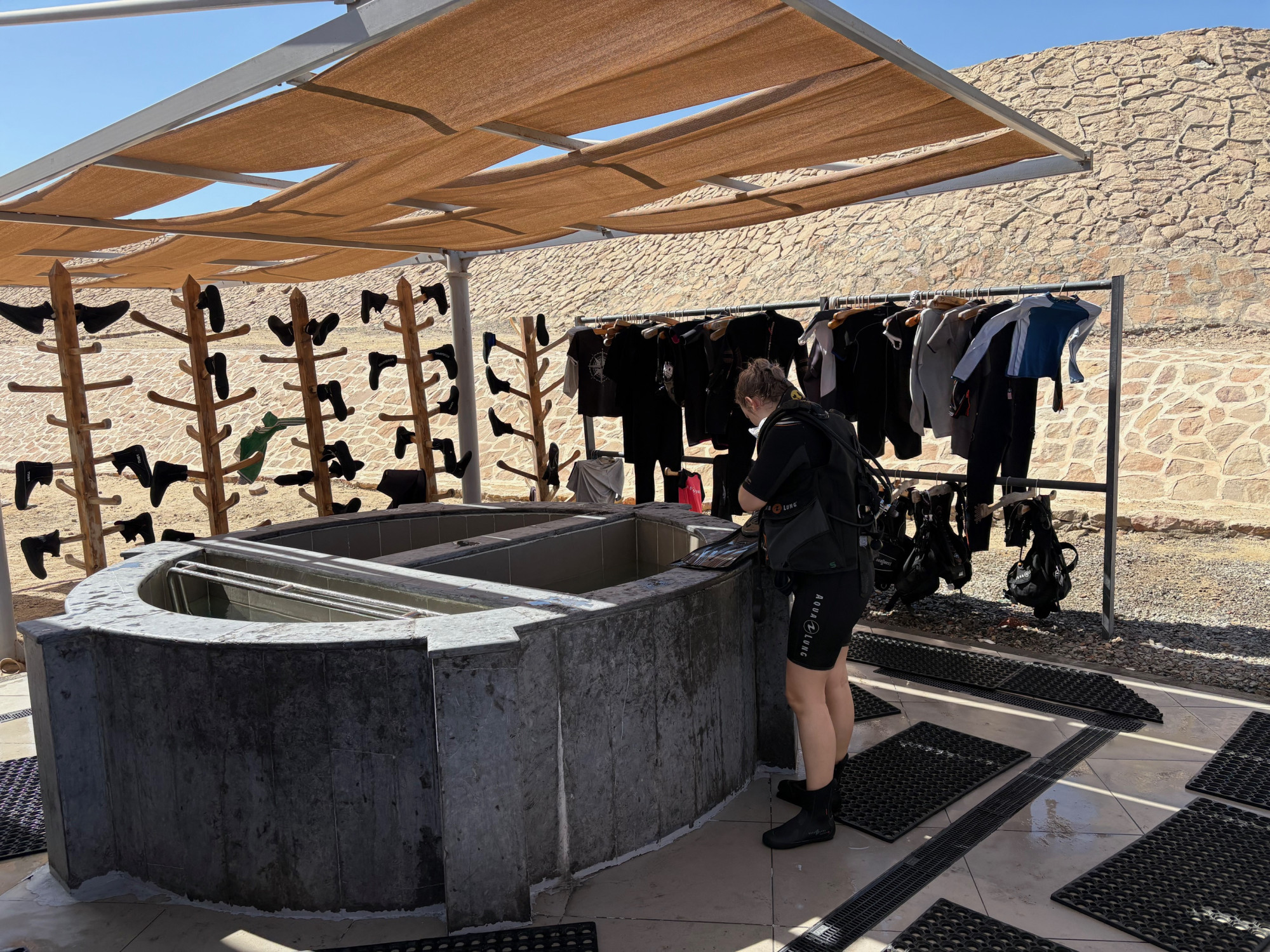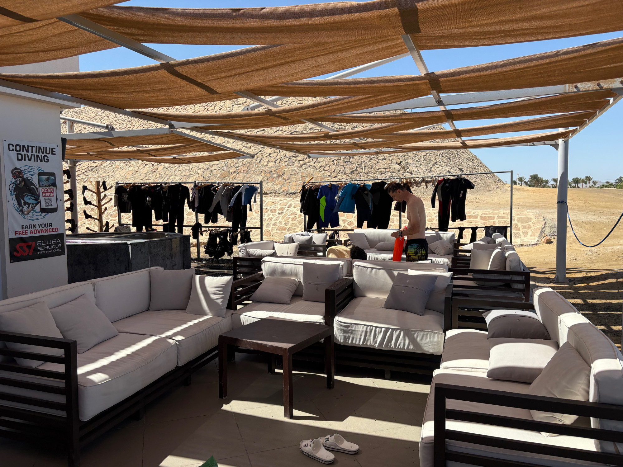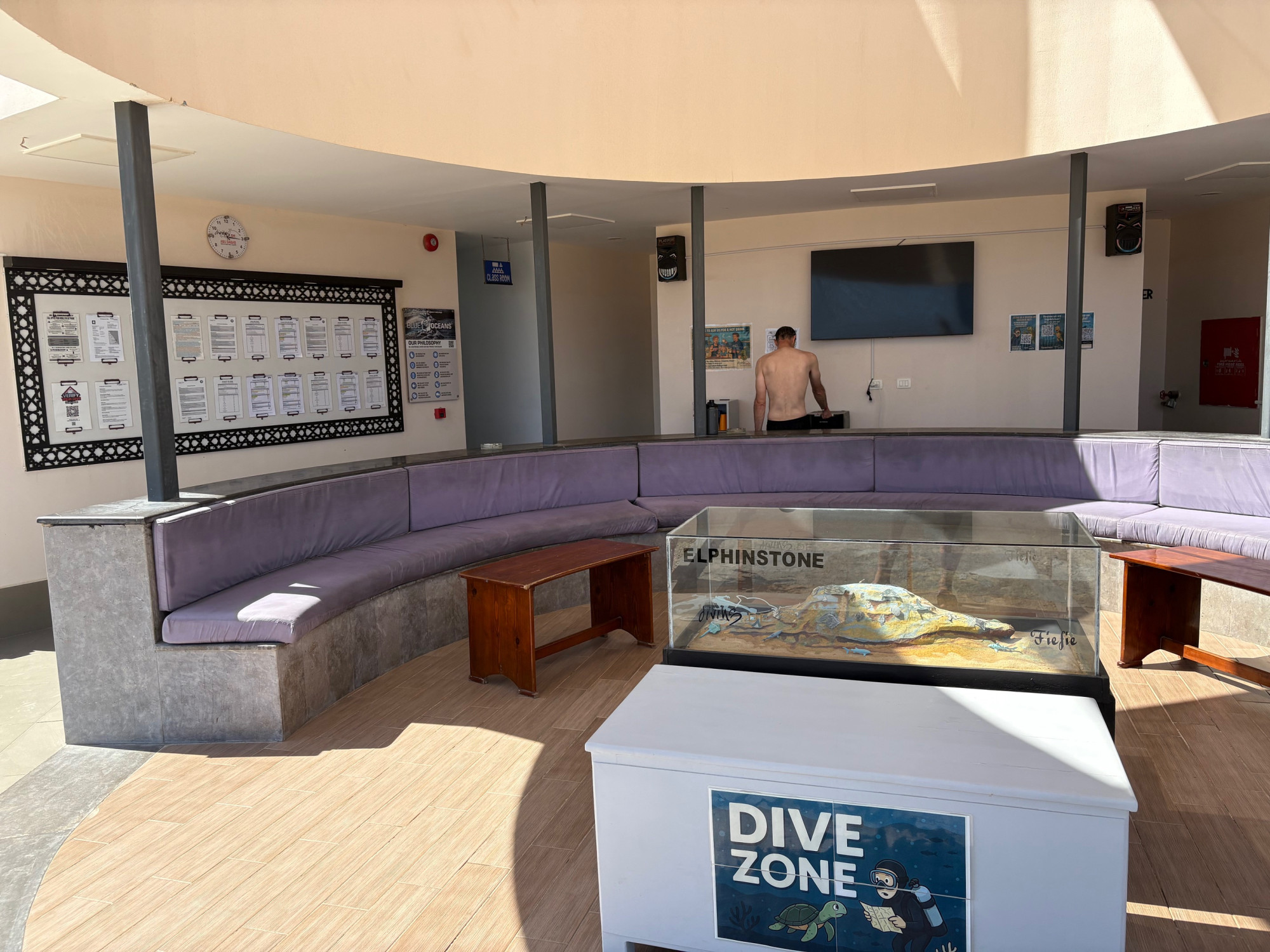 Die großzügig gestaltete moderne Tauchbasis befindet sich seit 2024 in einem neu gebauten Gebäude nur einen Steinwurf vom Strand und dem Einstieg in die Bucht entfernt.